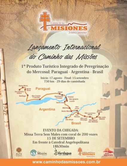 Entre os dias 17 de agosto e 15 de setembro de 2019 estará ocorrendo à primeira caminhada oficial internacional do “Camino de las Misiones”. Une os atrativos patrimônios culturais da humanidade e nacionais do território missioneiro do Paraguai, Argentina e Brasil.