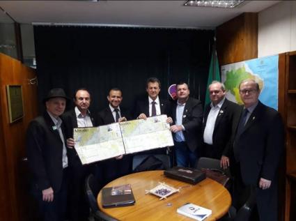 Estiveram em Brasília o Presidente da AMM, Prefeito Paulo Peixoto, o Presidente da Comissão, Prefeito Vilmar Kaiser, o Diretor do Detur, Prefeito Ricardo Klein, o Ex-presidente da AMM, Prefeito Brasil Sartori, o Secretário Executivo do Detur, Marcos Mattos e o Coordenador da Comissão Pró-Ponte, Secretario Ovídio Kaiser.