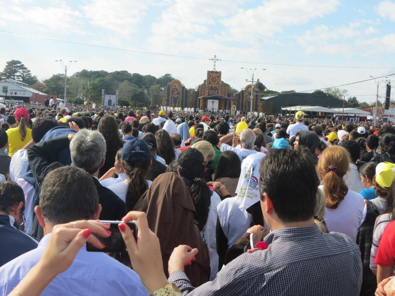 A Missa Papal teve início em torno de 11 horas da manhã, mas bem antes disso, às 5 horas, o grupo da AMM, assim como outras milhares de pessoas, já estavam no local do evento, em Assunção, no Paraguai. O cansaço era visível na expressão de todos que ali chegavam, mas a acolhida dos mais de 30 mil jovens paraguaios, que formaram um cordão humano e de mãos dadas saudavam os visitantes com muitos aplausos, entoando o nome de cada país ali representado, emocionou e renovou a energia dos fiéis de todas as idades, que não paravam de chegar e não se deixaram intimidar pelo intenso lodo causado pela chuva.