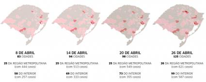 Em 8 de abril, os municípios de fora da Região Metropolitana concentravam apenas 36,66% do total de casos no Estado, o que demonstra um crescimento não só no número de cidades como também no total de casos.