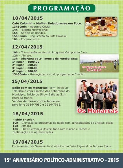 Uma programação especial, que iniciou dia 10 de abril e termina no domingo (19), foi preparada para celebrar o 15º aniversário político-administrativo de Rolador. A abertura oficial será nesta quarta-feira, dia 15 de abril, a partir das 18 horas, no Ginásio de Esportes. Na sequência e no mesmo local, às 19 horas começa o desfile de escolha das soberanas. E às 21 horas inicia o baile com Os Monarcas, tudo com entrada franca.
