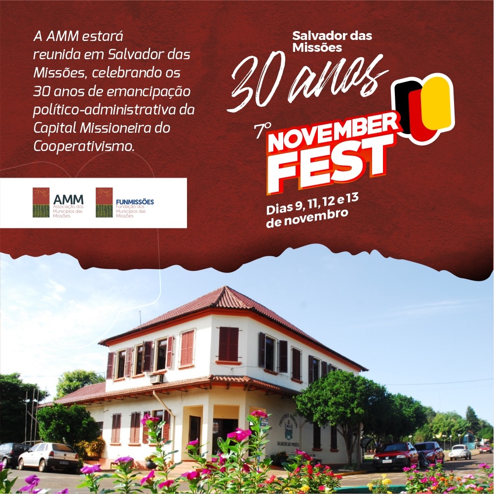 Salvador das Missões está comemorando 30 anos de emancipação político-administrativa, e uma extensa programação foi organizada pela Administração Municipal para festeja esta data. Hoje, ao final da tarde, acontece e abertura oficial da 7ª Novemberfest e 1º Encontro de Veículos Antigos, no Ginásio Municipal de Esportes e logo após um Show de Patinação com o Grupo Rosas do Sul, de São João do Oeste/SC.