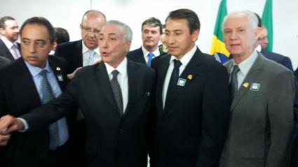 Presidente da AMM, Valdir Andres (direita), Presidente da Famurs, Luciano Pinto, e Presidente da República, Michel Themer