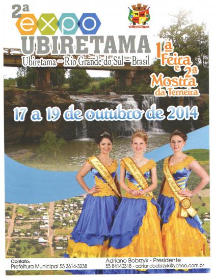 As festividades da 2ª Expo Ubiretama terão início na próxima próxima sexta-feira, dia 17 de outubro e vão até domingo, dia 19. Entre as inovações que serão apresentadas nesta edição destacam-se: Encontro Intermunicipal da Mulher; Encontro Regional dos Aposentados Rurais; Apresentações com Grupos Folclóricos Alemão Heimatland e Russo Troyka; Julgamento da 1ª Feira da Terneira. Outras diversificadas atrações como a reunião da Associação dos Legislativos das Missões (ALM); Palestras; Programa Cadeira de Balanço; Show Baile; Show Gospel; Show com Balada Sertaneja, também estão entre entre as excelentes opções do evento, que será realizado na Praça Telmo Mota/Lonão da Cultura, em Ubiretama.