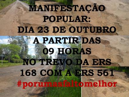 Na região das Missões, grupos de São Nicolau, Pirapó e Dezesseis de Novembro vão se reunir no trevo ERS 168 com a 561, e protestar contra más condições de trafegabilidade da rodovia