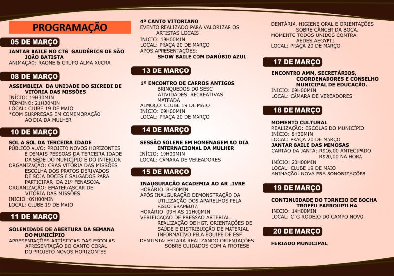 Desde o dia 5 de março, Vitória das Missões está em festa, com as comemorações alusivas aos 24 anos de emancipação político administrativa. Vale a pena conferir as  excelentes opções da programação, que vai até dia 20 deste mês.