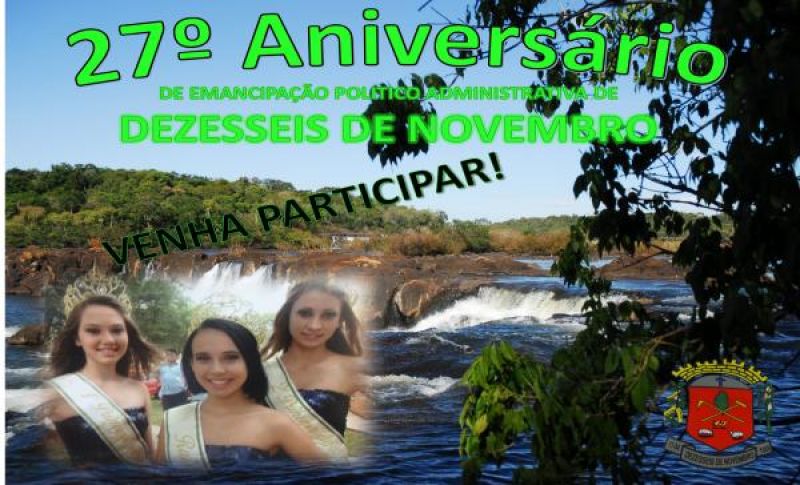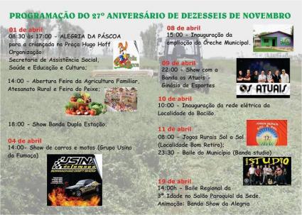 Com a presença de deputados federais e estaduais, prefeitos, vice-prefeitos, secretários municipais, vereadores, imprensa, comunidades e outros participantes, a solenidade oficial de abertura das festividades alusivas ao 27º aniversário do município de Dezesseis de Novembro será nesta quarta-feira, dia 1º de abril, às 14 horas, na Praça Municipal Hugo Hoff.