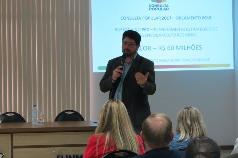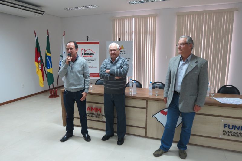 Na tarde de terça-feira (6/6) foi realizada na sede da Associação dos Municípios das Missões (AMM), a assembleia regional da Consulta Popular 2017 - Orçamento 2018, organizada pelo Conselho Regional de Desenvolvimento das Missões (Corede). Conduziram os trabalhos o presidente do Corede Missões, José Cláudio Lourega Reis, o coordenador regional da Participação Popular Cidadã, Daion Eldis Fener, o corrdenador estadual da Participação Popular Cidadã, Theonas Baumhardt, e o diretor da Secretaria estadual de Planejamento, Governança e Gestão, José Oltramari.