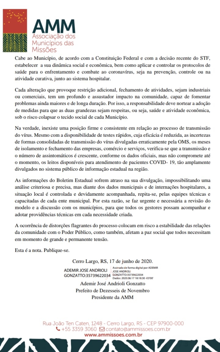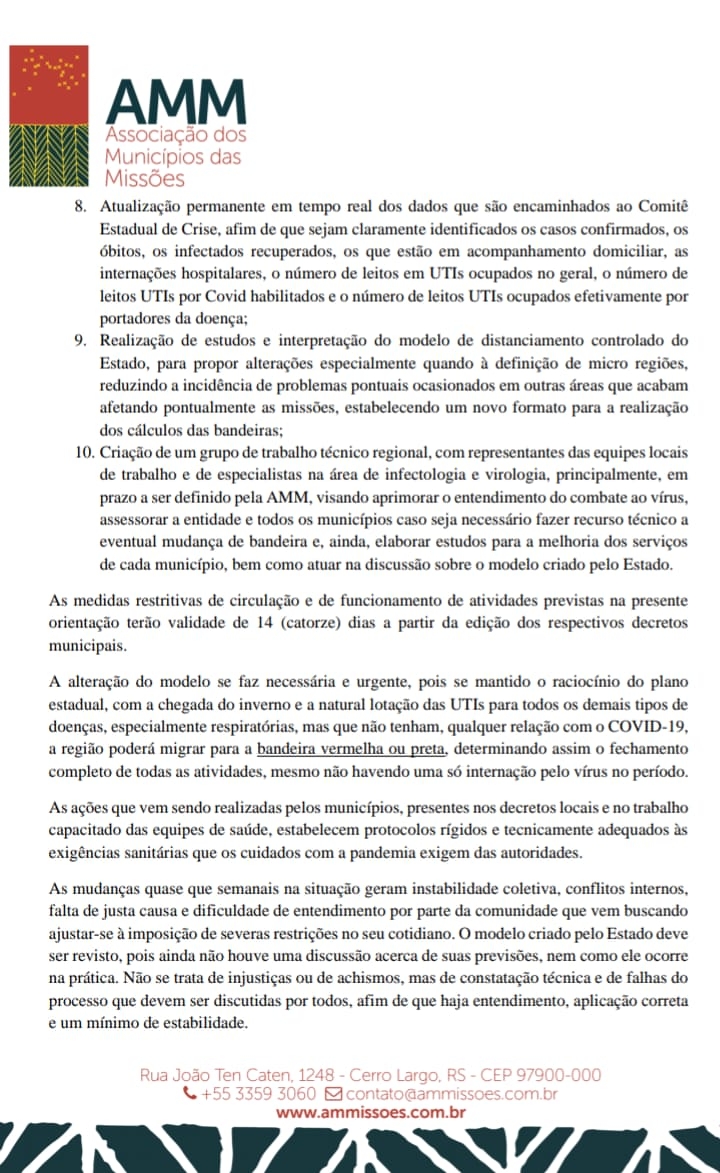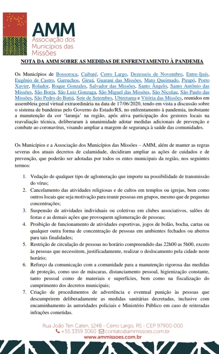 Os Municípios de Bossoroca, Caibaté, Cerro Largo, Dezesseis de Novembro, Entre-Ijuís, Eugênio de Castro, Garruchos, Giruá, Guarani das Missões, Mato Queimado, Pirapó, Porto Xavier, Rolador, Roque Gonzales, Salvador das Missões, Santo Ângelo, Santo Antônio das Missões, São Borja, São Luiz Gonzaga, São Miguel das Missões, São Nicolau, São Paulo das Missões, São Pedro do Butiá, Sete de Setembro, Ubiretama e Vitória das Missões, reunidos em assembleia geral virtual extraordinária na data de 17/06/2020, tendo em vista a discussão sobre o sistema de bandeiras pelo Governo do Estado/RS, no enfrentamento à pandemia, inobstante a manutenção da cor ‘laranja’ na região, após ativa participação dos gestores locais na reavaliação técnica, deliberaram à unanimidade adotar medidas adicionais de prevenção e combate ao coronavírus, visando ampliar a margem de segurança à saúde das comunidades.