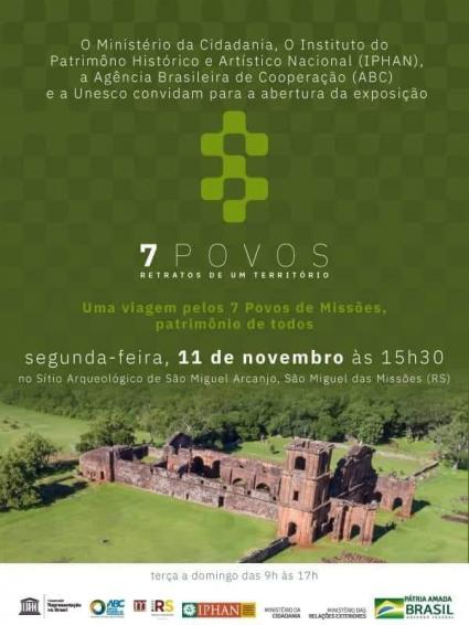 A iniciativa brasileira idealizada pelo Instituto do Patrimônio Histórico e Artístico Nacional (Iphan) faz parte de um projeto de cooperação internacional, em parceria com a Organização das Nações Unidas para a Educação, a Ciência e a Cultura (Unesco) e Agência Brasileira de Cooperação (ABC), vinculada ao Ministério das Relações Exteriores. Com a curadoria de Cláudia Ardións e projeto expográfico de Suzane Queiroz, 7 Povos desbrava o território das Missões, sua geografia, história, vida sociopolítica e cultural. Conta a narrativa da ocupação da região, desde mapas antigos até o momento atual - como se formou e no que se tornou o território das Missões, no Rio Grande do Sul.