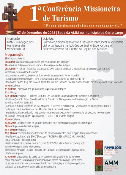 Turismo, fonte de desenvolvimento sustentável, será o tema norteador do evento, que inicia às 8 horas da manhã, quando será servido o café com pratos típicos dos municípios das Missões. O encerramento está previsto para às 17h30min. Projetos de turismo no meio rural; turismo cultural; incentivo à sociedade civil, setores públicos e instituições de ensino superior para investirem no setor; mensagens de motivação; visão do Estado sobre o turismo nas Missões; valorização da Paisagem Cultural e do Parque Histórico Nacional das Missões Jesuítica dos Guaranis; elaboração da Carta da 1º Conferência Missioneira de Turismo, estarão entre os diversos assuntos que serão abordados nos painéis.
