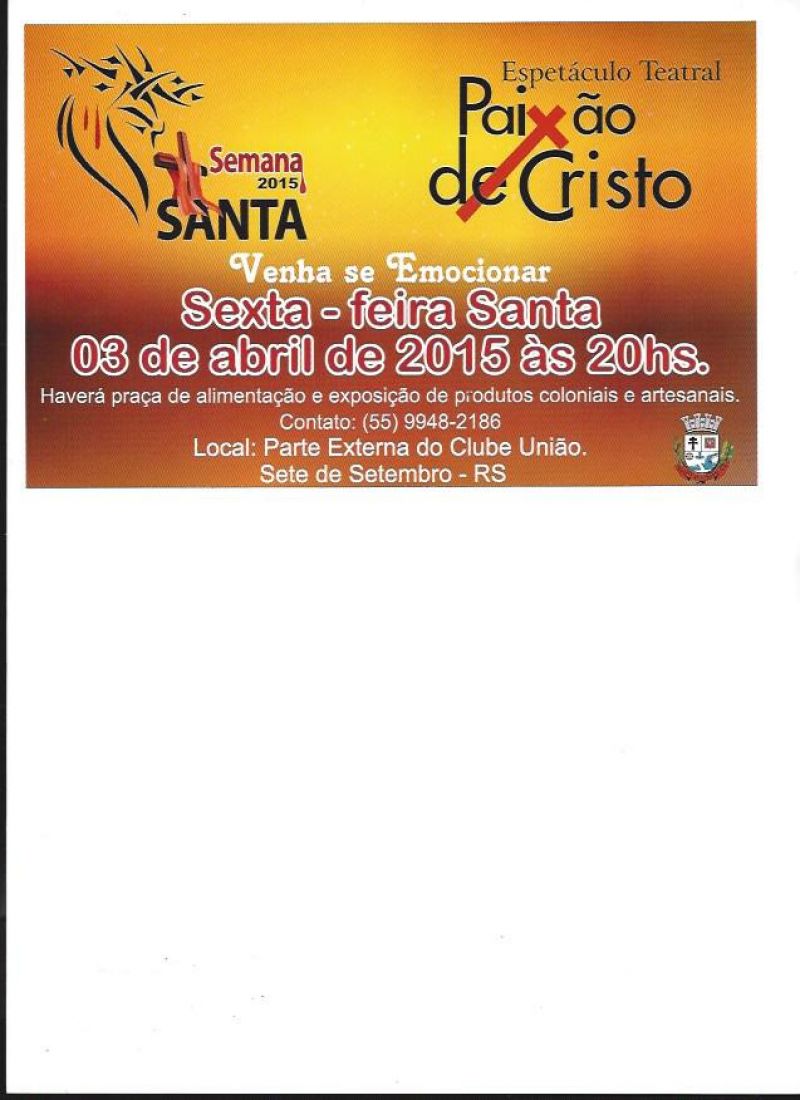 A equipe organizadora do evento está trabalhando para que, assim como na edição do ano passado que reuniu mais de 1.200 pessoas, seja um momento de reflexão e religiosidade. Além disso, os convidados poderão desfrutar da praça de alimentação com saborosos produtos coloniais. Outro destaque, será uma exposição com o diversificado artesanato produzido em Sete de Setembro. Vale a pena participar do espetáculo que promete comoção, e vai ocorrer na parte externa do clube União.