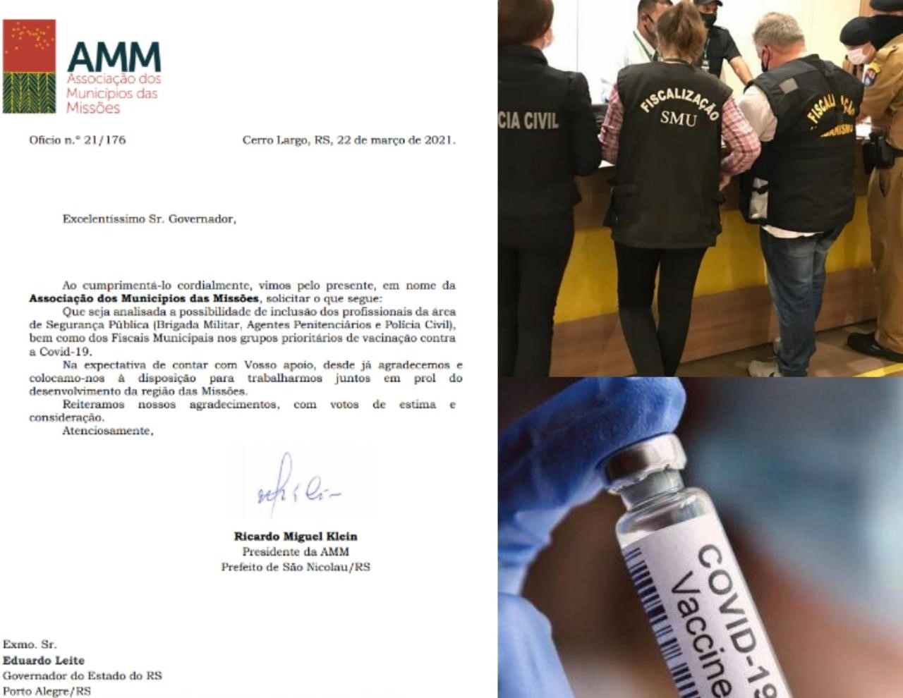 O Presidente da AMM – Associação dos Municípios das Missões, Prefeito de São Nicolau Ricardo Klein, representando os 26 gestores missioneiros, que são associados da entidade, enviou ofício ao Governador do Estado Eduardo Leite, solicitando que os profissionais de segurança pública (agentes penitenciários, policiais civis e militares), bem como os fiscais municipais sejam inseridos no grupo prioritário para vacinação.